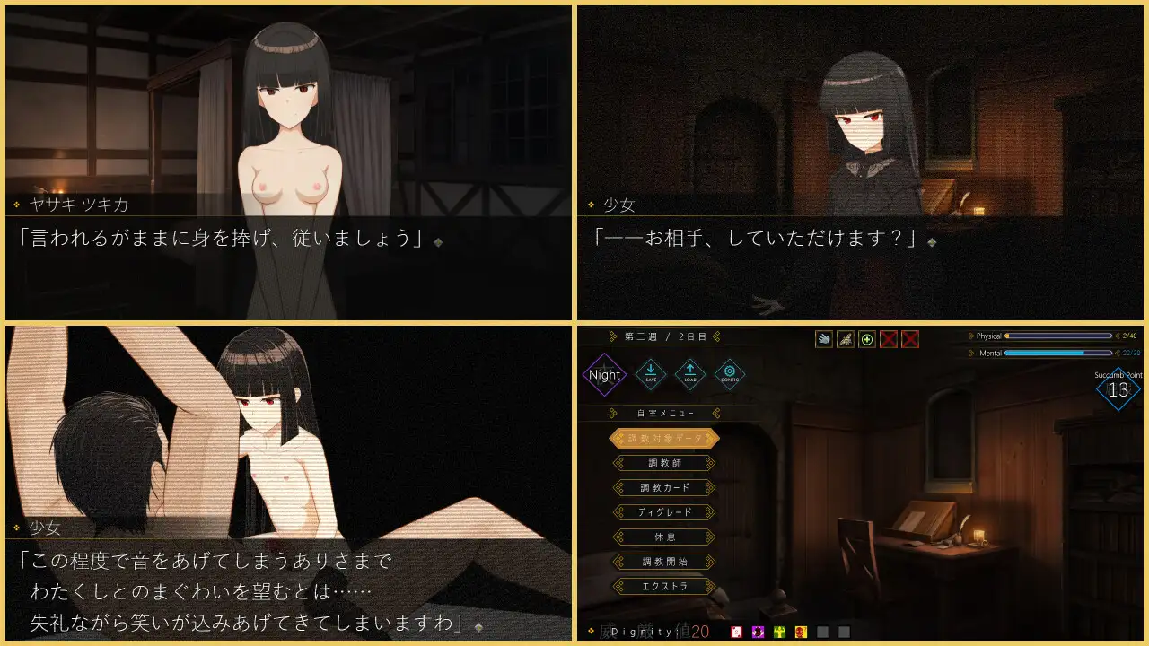 ロベリア・マリスレッドから依頼を受けた調教師が奴隷の女の子・ツキカを調教するも、次第に立場が逆転しマゾ堕ちさせられちゃうローグライク風逆調教シミュレーションゲーム。 Hシーンは全て逆レイプで構成され、ツキカの指技や奉仕に翻弄され、マリスレッドから罰を受け、手コキや足コキ、逆アナルにいたるまでのハードなプレイまで、調教師である立場を忘れるほどの快楽で徹底的に敗北。