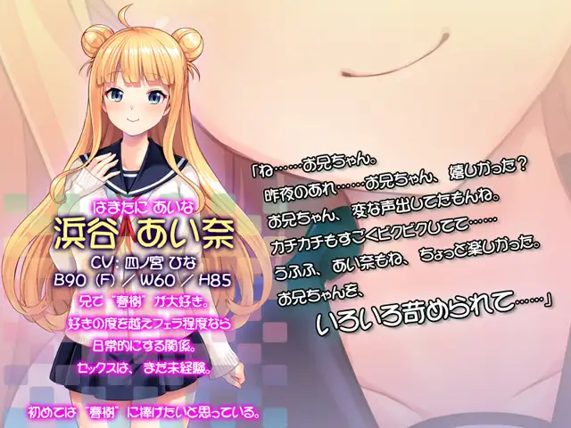 兄である主人公が……可愛い妹から言い寄られる!Hな妹に迫られ、イかされる!妹に童貞を食べられちゃう!……つまり、妹にHなイタズラをされるゲームです!
